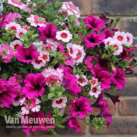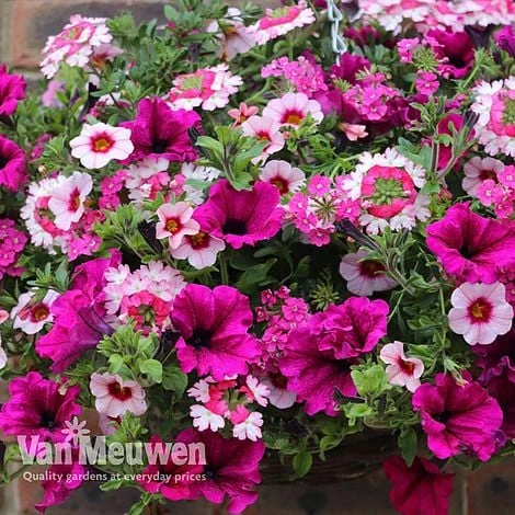 Introducing the easiest way to create a truly mixed basket! The remarkable combinations are created by propagating three trailing bedding plants into 1 plug cell. As these vigorous summer plants grow larger they will naturally mingle together to form a stunning ball of colour, ideal for patio containers, window boxes and hanging baskets. Just one plug will create masses of colour in a 3 litre container whilst three plugs will completely fill a 35cm (14″) diameter basket! Our Eton Mess basket is made up of red petunia, pink calibrachoa and red verbena which will all mingle together to form a stunning ball of colour.. Trails to: 45cm (18″).