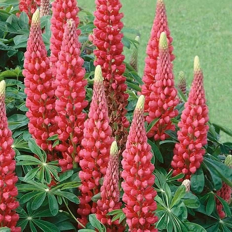 The scarlet pea-like flowers of Lupin ‘The Page’ are tightly packed on tall architectural spires. Carefully bred for a long flowering period with unbeatable garden performance. This traditional cottage garden perennial creates a strong impression in borders or planted in groups at the edge of woodlands. Height: 90cm (36″). Spread: 75cm (30″).
